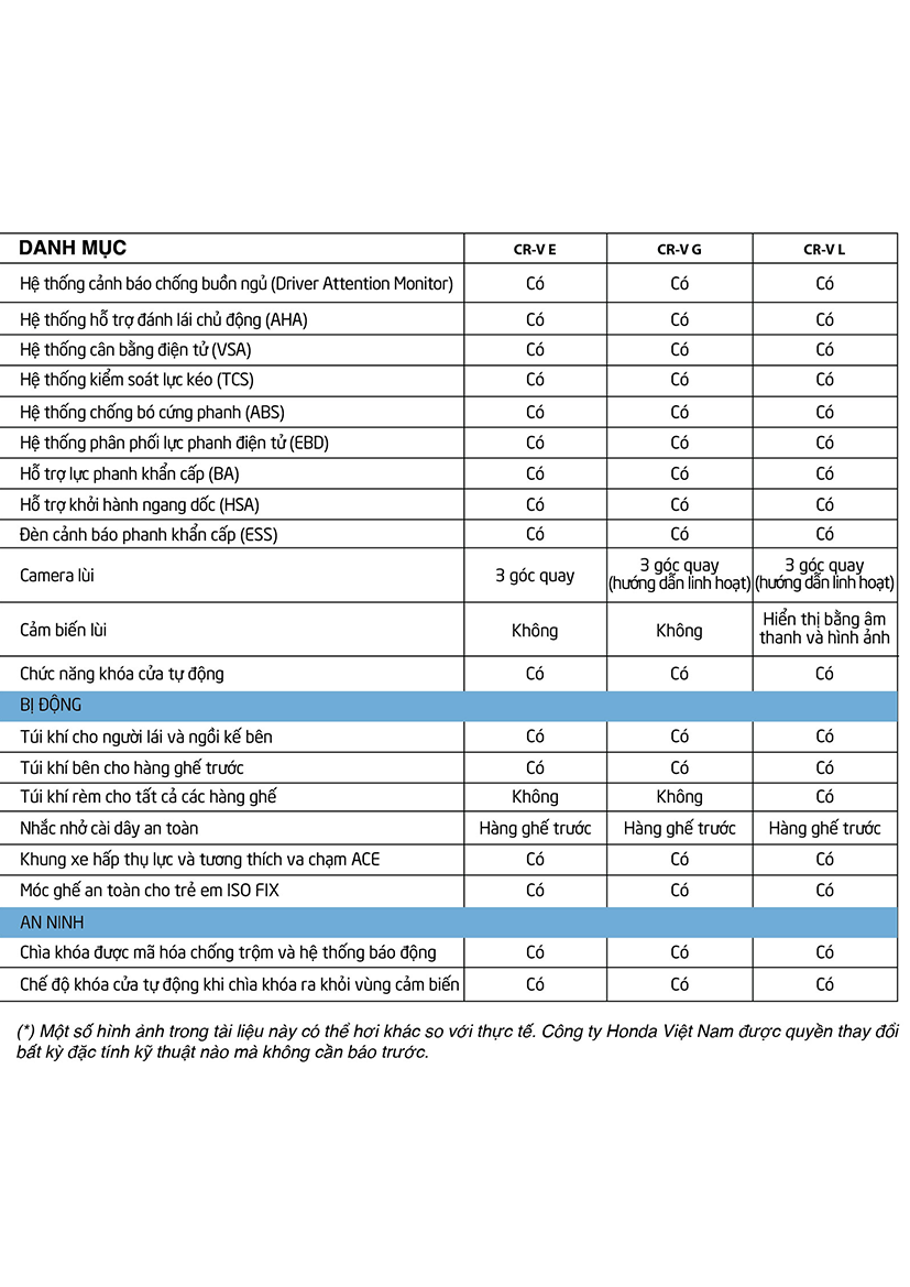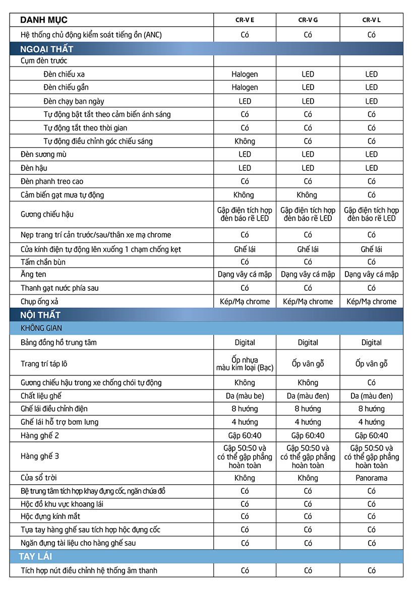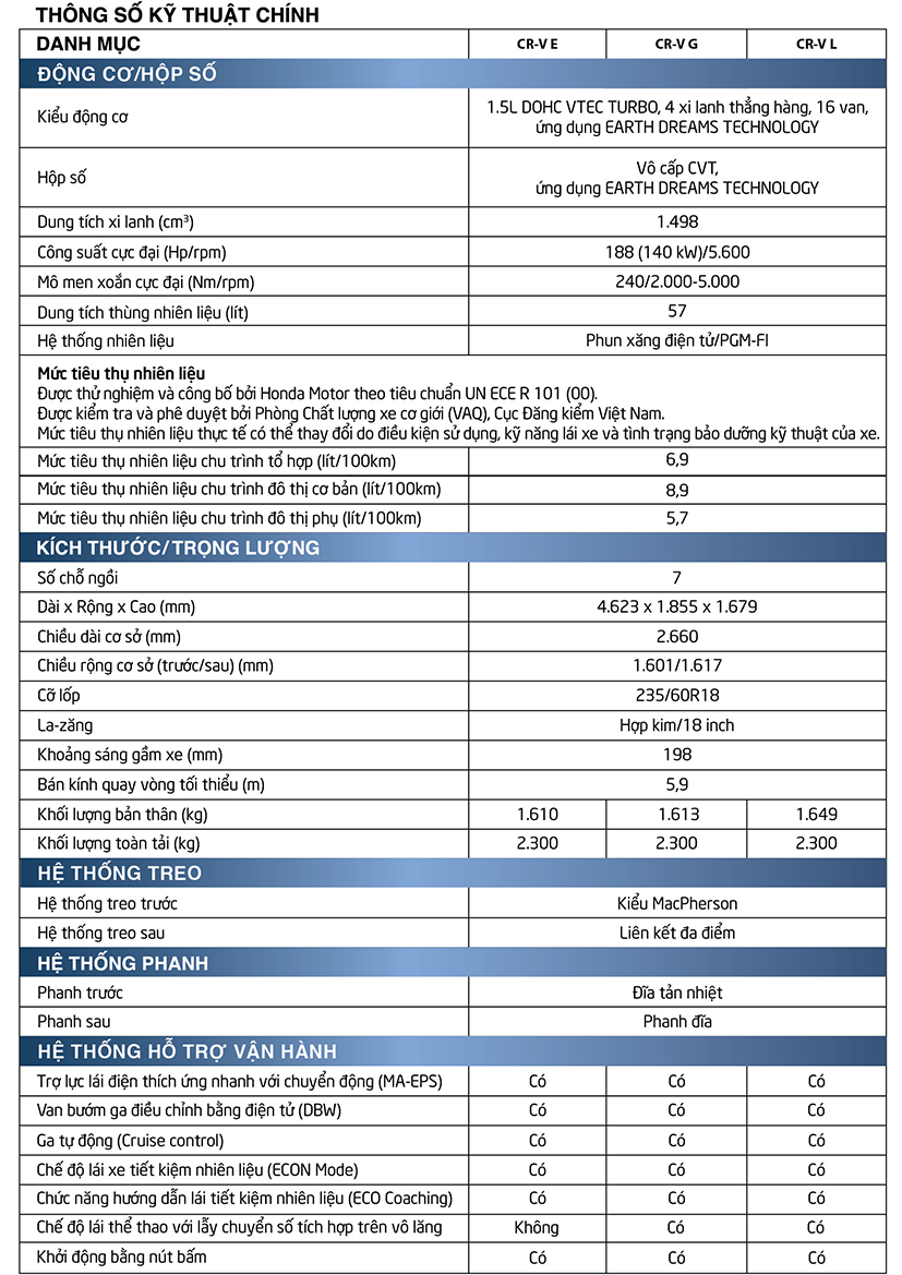 Hiện nay, phiên bản Honda CRV 2020 tại Việt Nam gồm có: Honda CRV 1.5E, CRV 1.5G và CRV 1.5L với mức giá được niêm yết vào 03/2020